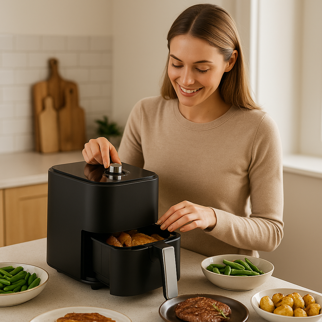 Frytkownica nagrzewa się błyskawicznie i nie wymaga pilnowania jak patelnia. Wkładasz składniki, ustawiasz pokrętło i wracasz, gdy potrawa jest gotowa. To idealny sposób na szybki obiad po pracy, bez stania nad kuchenką.